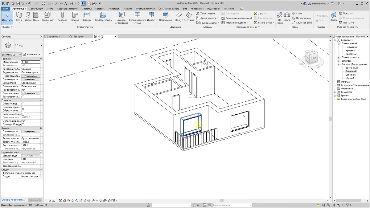 - Создание стен, дверей, окон. Делается по чертежу и осям.
