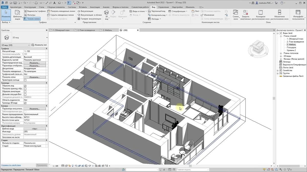 Далее в проекте можно назначить коммуникации, материалы, свойства поверхностей, развернуть 3D-модель в полноценный чертеж и т. д. Чтобы работать быстрее, стоит изучить горячие клавиши.