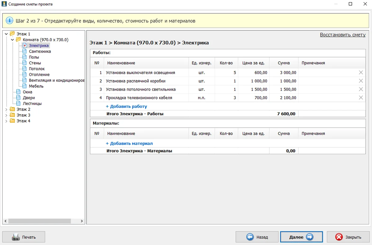 Проект, созданный здесь, удобен тем, что вы сразу видите список всего, что нужно для монтажа. Программа подтягивает в смету оборудование и материалы, разделяя их по комнатам. Это особенно полезно для тех, кто собирается делать ремонт постепенно: сначала на кухне, потом в ванной, затем в гостиной. Формируя списки для каждого помещения, можно избежать перерасхода и лишних поездок по магазинам.